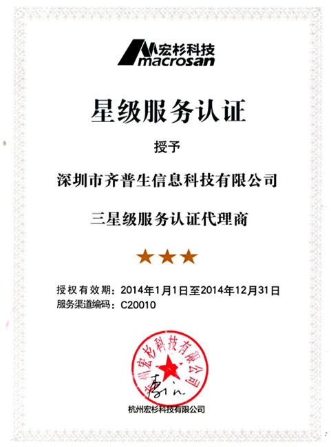 2013年12月,齊普生公司再傳喜訊:榮獲杭州宏杉科技有限公司(以下簡(jiǎn)稱:宏杉科技)三星級(jí)服務(wù)認(rèn)證代理商資格證書!